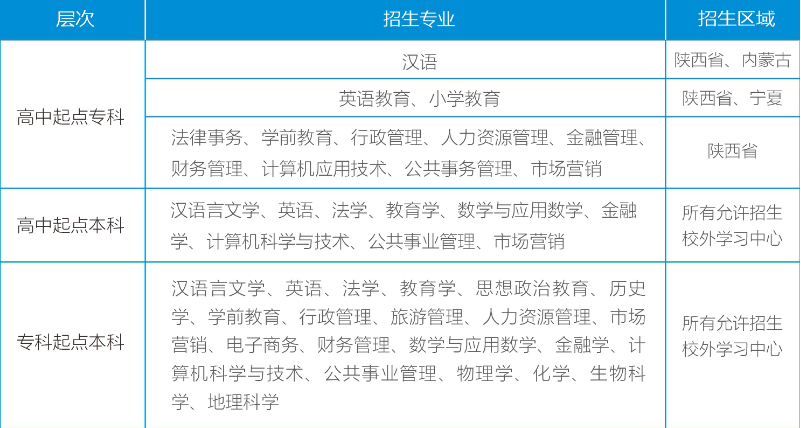 网络教育开设高中起点专科、高中起点本科、专科起点本科3个教育层次,开设汉语言文学、教育学、英语、计算机科学与技术等33个专业。按照教育部现代远程教育校外学习中心建设的有关要求,发挥网络教育远程办学优势,在有关省市教育主管部门的支持下,与相关办学机构合作,建立了立足陕西、服务西部、面向全国的100多个校外学习中心。